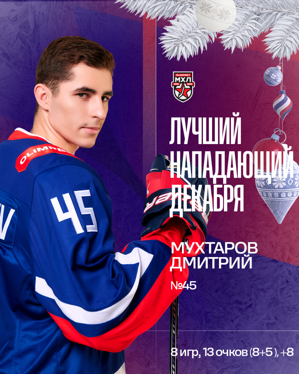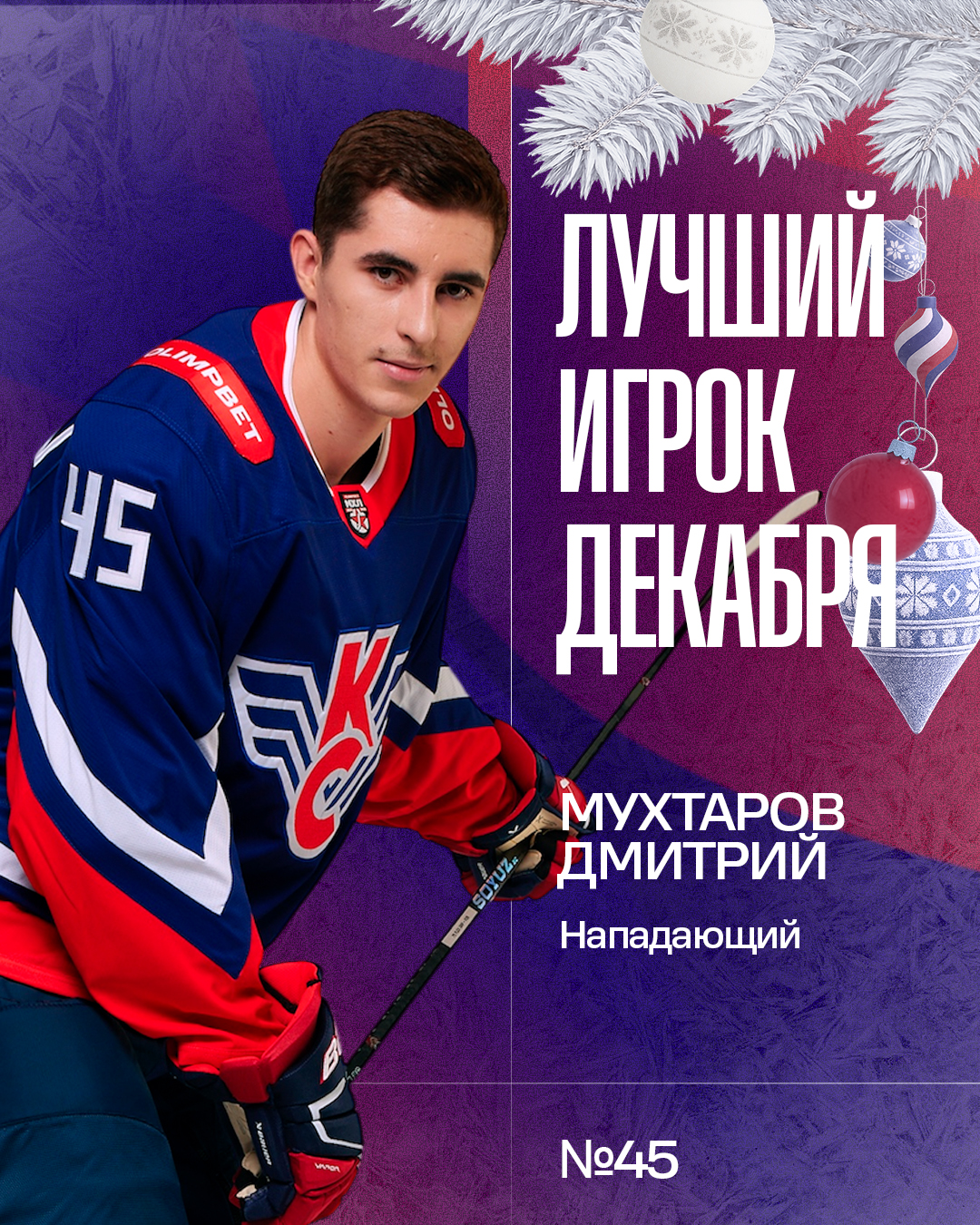По итогам голосования болельщиков, лучшим игроком ХК «Крылья Советов» в декабре стал форвард Дмитрий Мухтаров.